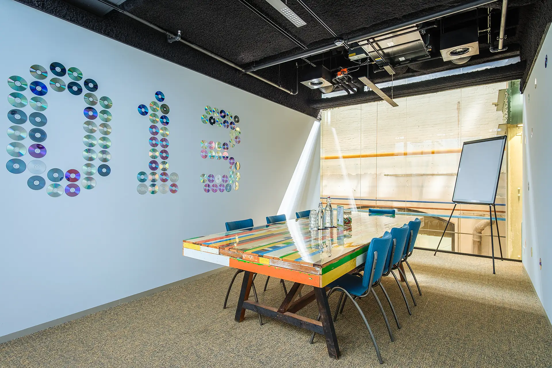 Met zijn lichte, uitnodigende vloerbedekking biedt Vergaderzaal 013 een vrolijke en warme sfeer, perfect voor kleine vergaderingen of workshops. Extra gemak nodig? Boek een flatscreen, die wij voor je klaarzetten en aansluiten, zodat je meteen van start kunt. Voor een heerlijke kop koffie hoef je alleen maar de hoek om.